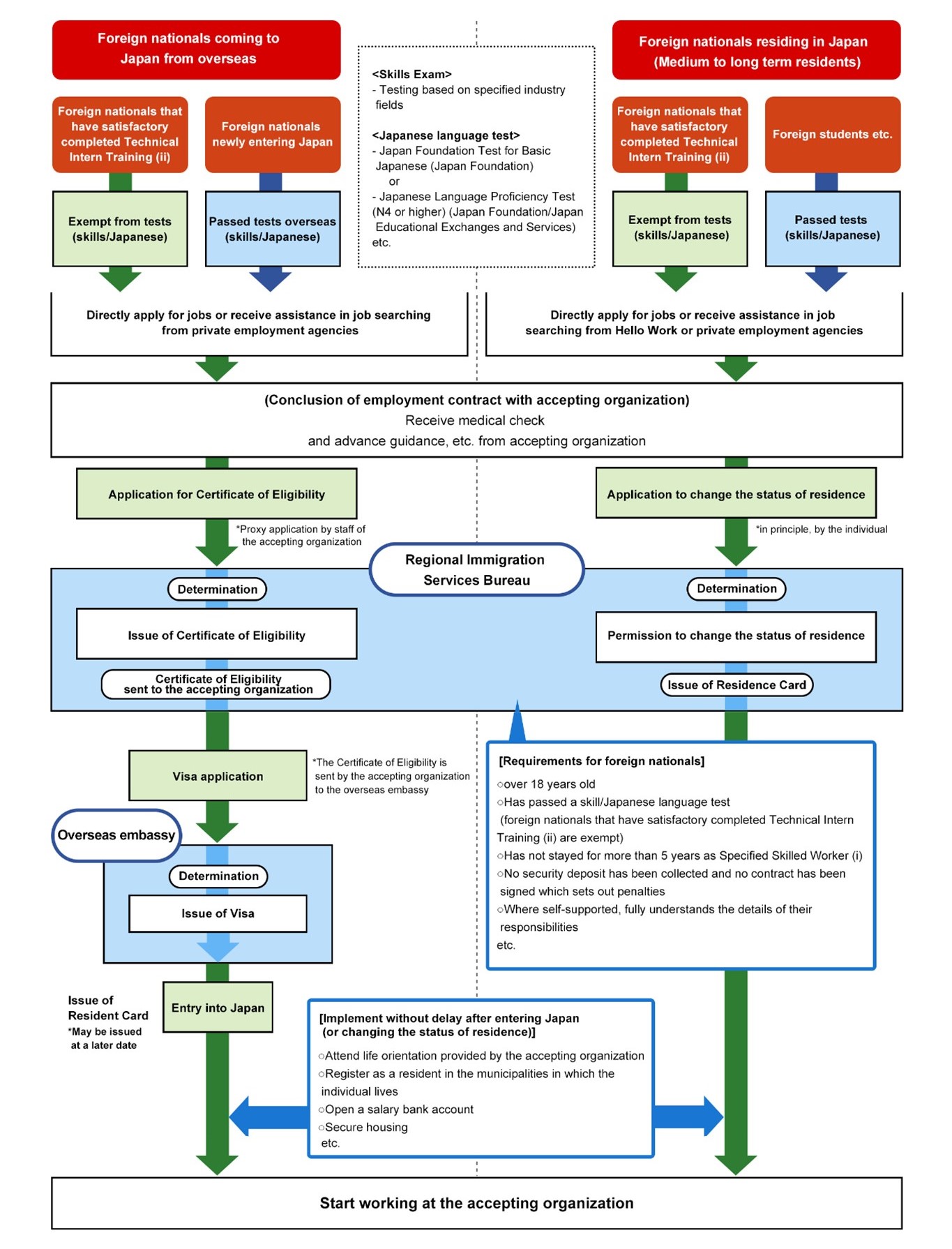 In order to obtain a “Specified Skilled Worker(ⅰ)” status of residence, it is necessary to pass the “Japan Foundation Test for Basic Japanese (JFT-Basic)” or acquire the N4 certificate for the “Japanese Language Proficiency Test (JLPT)”. Both JFT-Basic and JLPT are conducted within and outside Japan.(Not required for SSW(ⅱ))